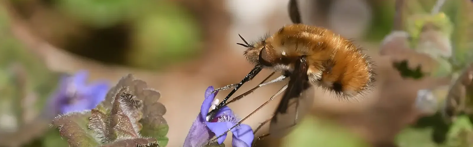 Stor humleflue er en lodden flue med en lang snabel, som stikker lige fremefter.